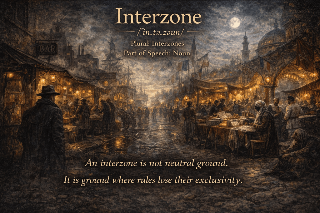 From this geopolitical usage, interzone migrated into literature and cultural theory, where it came to signify spaces of legal ambiguity, cultural hybridity, and moral suspension. It names environments where norms dissolve, borders blur, and identities become provisional.