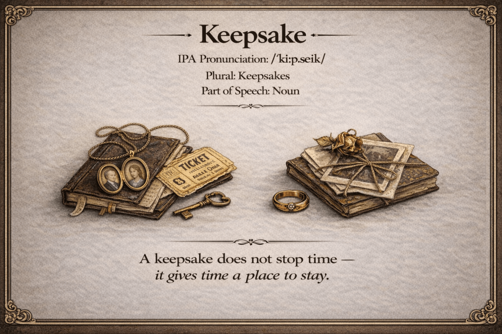 Keepsake arises from domestic and sentimental contexts rather than formal institutions. It names an object kept not for use or value, but for remembrance — a material anchor for memory, affection, or loss.