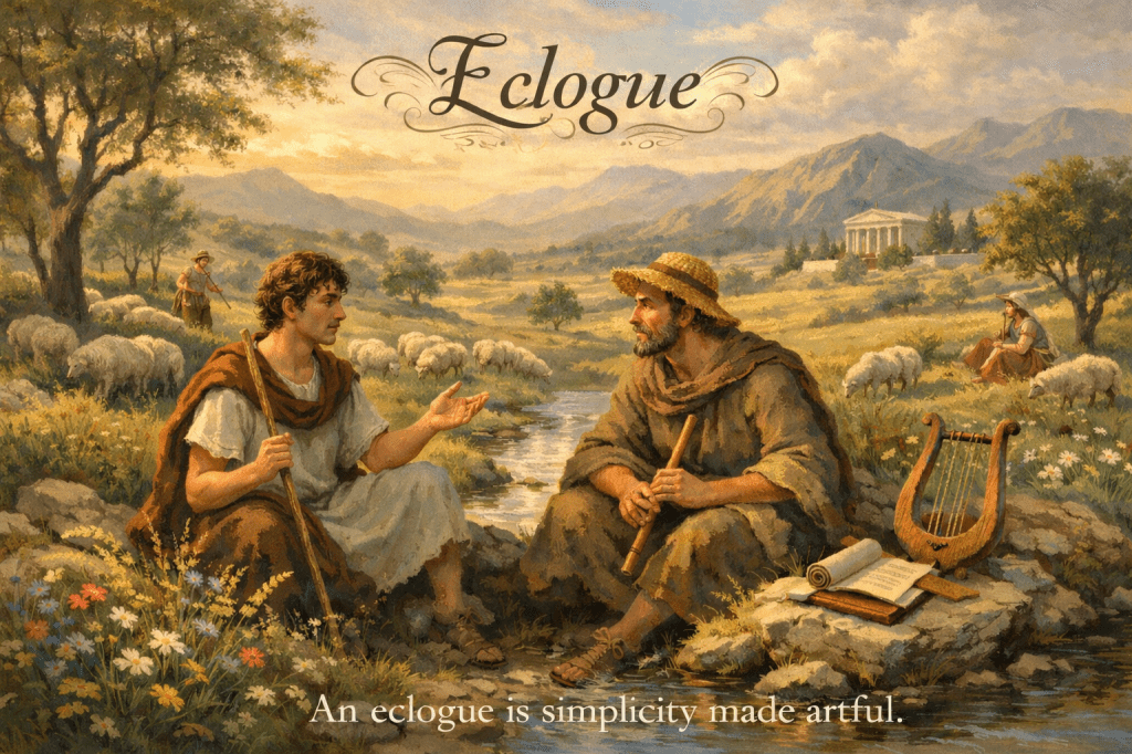 Eclogue belongs to the vocabularies of poetry, pastoral literature, and classical studies. It refers to a short pastoral poem, often written as a dialogue, depicting rural life, shepherds, landscapes, and reflections on nature, love, or song.