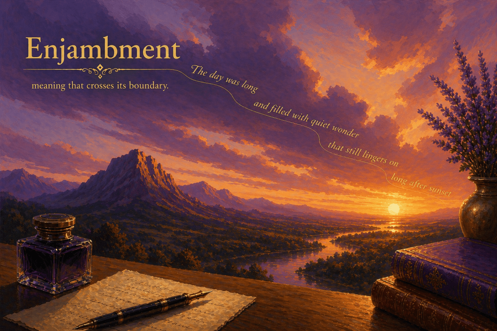 Enjambment belongs to the vocabularies of poetry, form, and movement. It refers to the continuation of a sentence or phrase beyond the end of a line, without a pause or terminal punctuation.