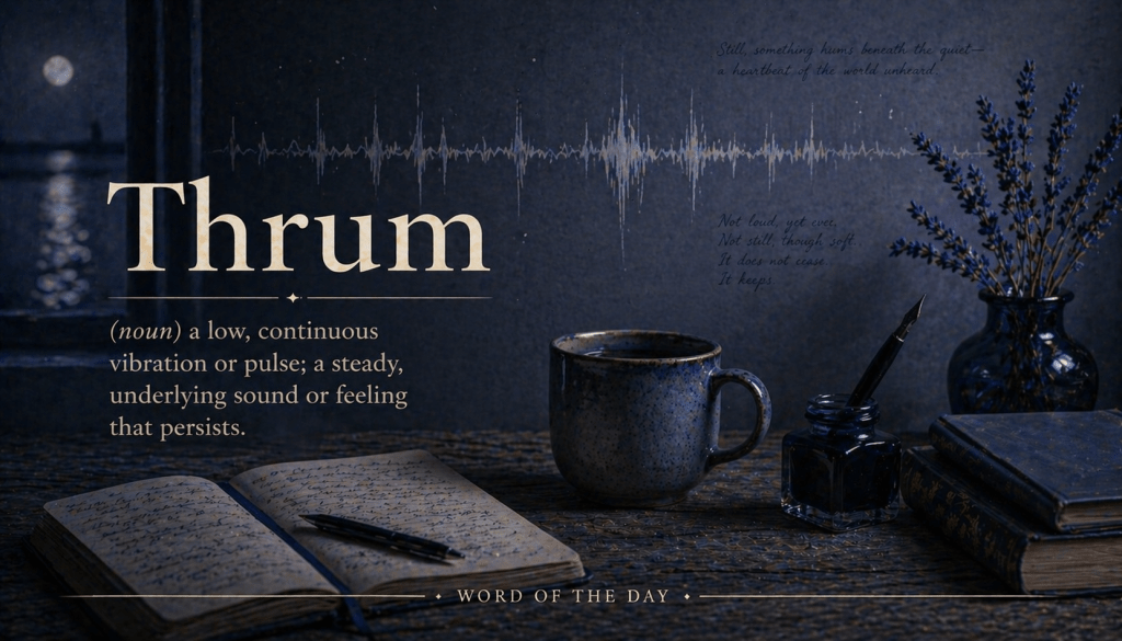 Thrum belongs to the vocabularies of sound, vibration, and quiet persistence. It refers to a continuous low, rhythmic humming or vibrating sound — often soft, steady, and felt as much as heard.